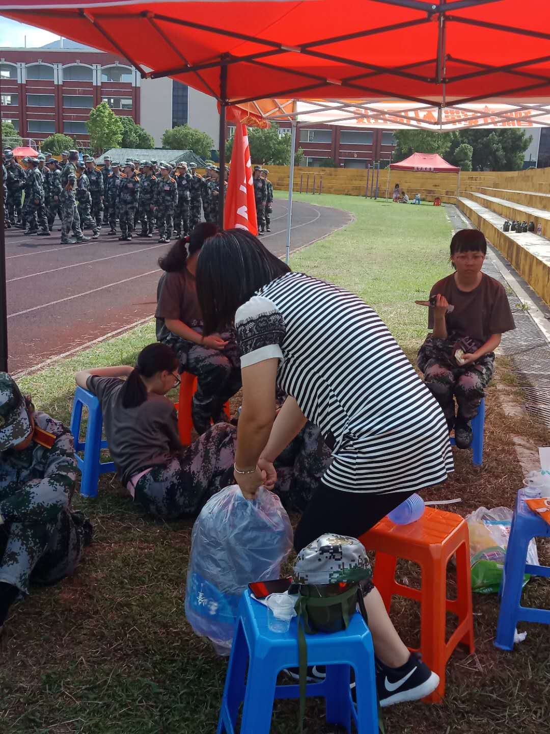 两位领导不畏炎热,更是贴心地为员工准备了红糖姜包、葡萄糖等物品。现场的员工训练情况良好,不管是站军姿还是齐步队列训练,大部分员工都能坚持下来,完成教官指令。辅导员、值班老师及员工也都坚守岗位,照顾身体不适的员工,及时帮他们降温预防中暑。对员工在军训现场的坚强表现,学院领导也给予了鼓励和肯定。