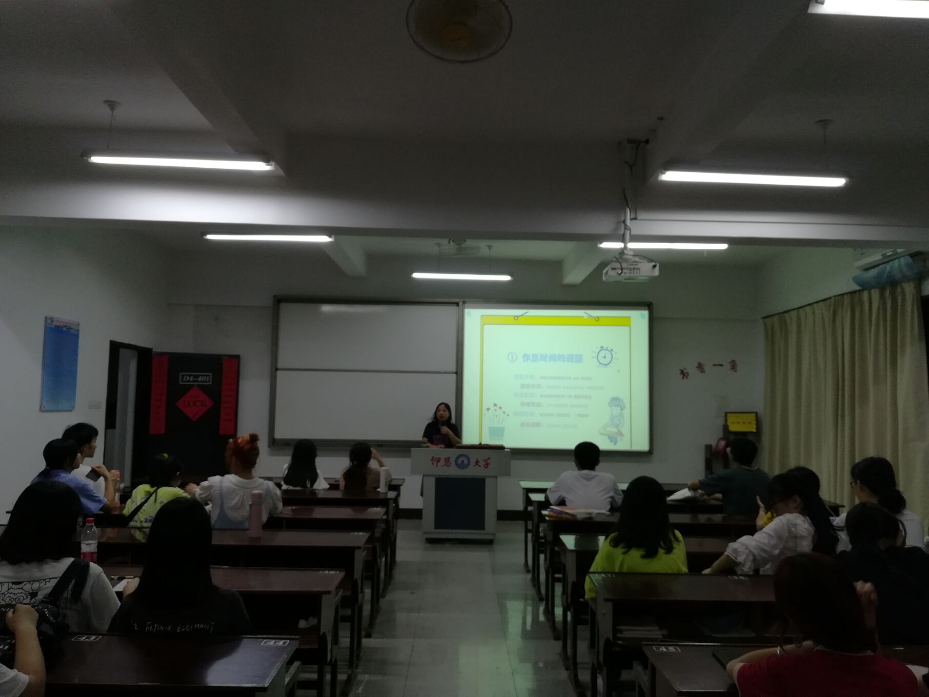 2020年8月30日星期日,17英语二班在仰恩楼固定教室D4-401开展了以“开学第一堂课”为主题的班会。班会课上,班主任庄金英老师强调要遵守学校的各种防控措施,不要去人群密集的地方。此外,班主任还强调开学要调整好作息,快速进入学习状态以便认真学习和备考,同学们要及时进行心理的自我调整,开学初如若遇到困难,需要及时和老师进行沟通。新学期新气象,希望同学们能平安快乐的学习,度过美好愉快的新学期。