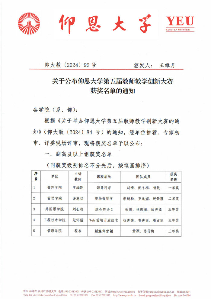 主讲教师刘长程副教授及其团队成员胡娟、林燕媚和位美娅,以《综合英语3》课程的创新与实践为题获奖。他们的报告展示了如何利用数字技术提升员工的英语综合能力。通过数字化手段融入中国文化,展现中国元素等教学方法,提高员工高阶认知能力,加强课程思政与主题内容的融合,员工在听说读写各方面的能力得到了显著提高。刘长程团队的创新教学方法为英语专业教学提供了新的思路和方法。